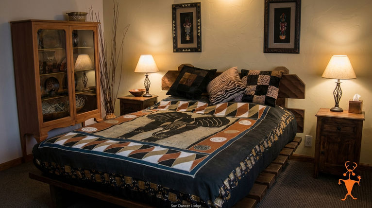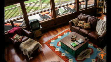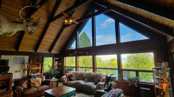 Photos of Sun Dancer Lodge interiors, outdoor living spaces, property views, and surrounding forest landscape.